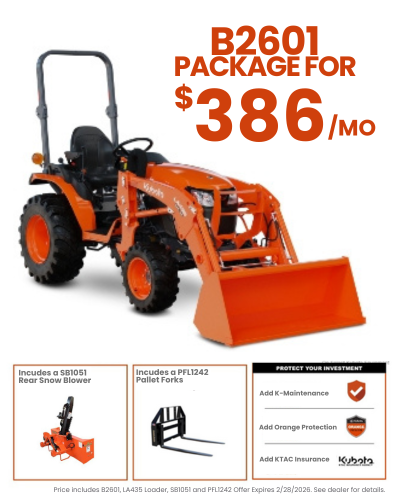 SEE DETAILS© Kubota Tractor Corporation, 2026. 4.99% A.P.R., financing for up to 84 months on purchases of new Kubota B2601hsd from participating dealers’ in-stock inventory is available to qualified purchasers through Kubota Credit Corporation, U.S.A., subject to credit approval. Example: 84 monthly payments of $14.60 per $1,000 financed. Each dealer sets their price. Offers expire 02/28/26.Terms subject to change. Customer instant rebates up to $2,500 are available with promotional rate financing. 6 years limited powertrain warranty, Kubota Tractor Corporation does not authorize any person to create for KTC any obligation or liability other than that stated in the limited warranty. This material is for descriptive purposes only. Kubota disclaims all representations and warranties, express or implied, or any liability from the use of this material. Eligible Kubota Tractor and Implement products must be new to qualify for the Snow Implement Coupon program. Not all implements are eligible for the Snow Implement Coupon. For complete warranty, disclaimer, safety and product, and incentive offer information, consult your local Kubota dealer and the Owner’s Warranty Information Guide for the Kubota limited warranty on all products. Visit KubotaUSA.com/disclaimers for more information.*Based on EDA/UCC Data from 01/01/2020 - 12/31/2024 for sales of new tractors 0-200 Hp in the USA.