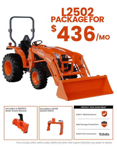 SEE DETAILS© Kubota Tractor Corporation, 2026. 4.99% A.P.R., financing for up to 84 months on purchases of new Kubota L2502hst from participating dealers’ in-stock inventory is available to qualified purchasers through Kubota Credit Corporation, U.S.A., subject to credit approval. Example: 84 monthly payments of $14.60 per $1,000 financed. Each dealer sets their price. Offers expire 02/28/26.Terms subject to change. Customer instant rebates up to $2,500 are available with promotional rate financing. 6 years limited powertrain warranty, Kubota Tractor Corporation does not authorize any person to create for KTC any obligation or liability other than that stated in the limited warranty. This material is for descriptive purposes only. Kubota disclaims all representations and warranties, express or implied, or any liability from the use of this material. Eligible Kubota Tractor and Implement products must be new to qualify for the Snow Implement Coupon program. Not all implements are eligible for the Snow Implement Coupon. For complete warranty, disclaimer, safety and product, and incentive offer information, consult your local Kubota dealer and the Owner’s Warranty Information Guide for the Kubota limited warranty on all products. Visit KubotaUSA.com/disclaimers for more information.*Based on EDA/UCC Data from 01/01/2020 - 12/31/2024 for sales of new tractors 0-200 Hp in the USA.