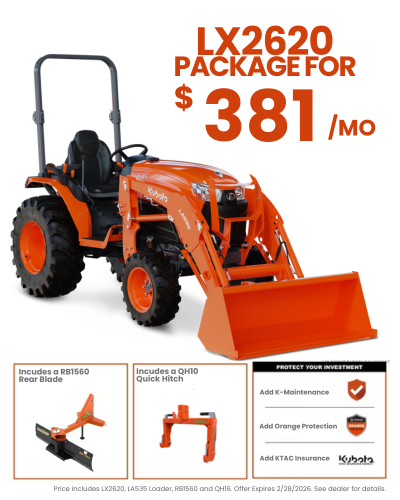 SEE DETAILS© Kubota Tractor Corporation, 2026. 4.99% A.P.R., financing for up to 84 months on purchases of new Kubota LX2620hst from participating dealers’ in-stock inventory is available to qualified purchasers through Kubota Credit Corporation, U.S.A., subject to credit approval. Example: 84 monthly payments of $14.60 per $1,000 financed. Each dealer sets their price. Offers expire 02/28/26.Terms subject to change. Customer instant rebates up to $2,500 are available with promotional rate financing. 6 years limited powertrain warranty, Kubota Tractor Corporation does not authorize any person to create for KTC any obligation or liability other than that stated in the limited warranty. This material is for descriptive purposes only. Kubota disclaims all representations and warranties, express or implied, or any liability from the use of this material. Eligible Kubota Tractor and Implement products must be new to qualify for the Snow Implement Coupon program. Not all implements are eligible for the Snow Implement Coupon. For complete warranty, disclaimer, safety and product, and incentive offer information, consult your local Kubota dealer and the Owner’s Warranty Information Guide for the Kubota limited warranty on all products. Visit KubotaUSA.com/disclaimers for more information.*Based on EDA/UCC Data from 01/01/2020 - 12/31/2024 for sales of new tractors 0-200 Hp in the USA.